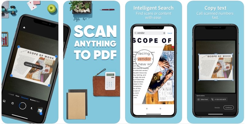 I na jednom i na drugom mobilnom OS-u funkcije su mu iste: lako skeniranje kamerom mobitela, kojom se može "uhvatiti" tiskani dokument, obrazac, posjetnica, slika, ili zapis s ploče u kakvoj učionici. Adobe Scan za sve ove primjene ima zasebne načine rada koji će optimizirati rezultate i pretvoriti snimljenu fotografiju u kvalitetan sken, bez sjena, odbljeska ili drugih "smetnji" koje je kamera možda zabilježila.