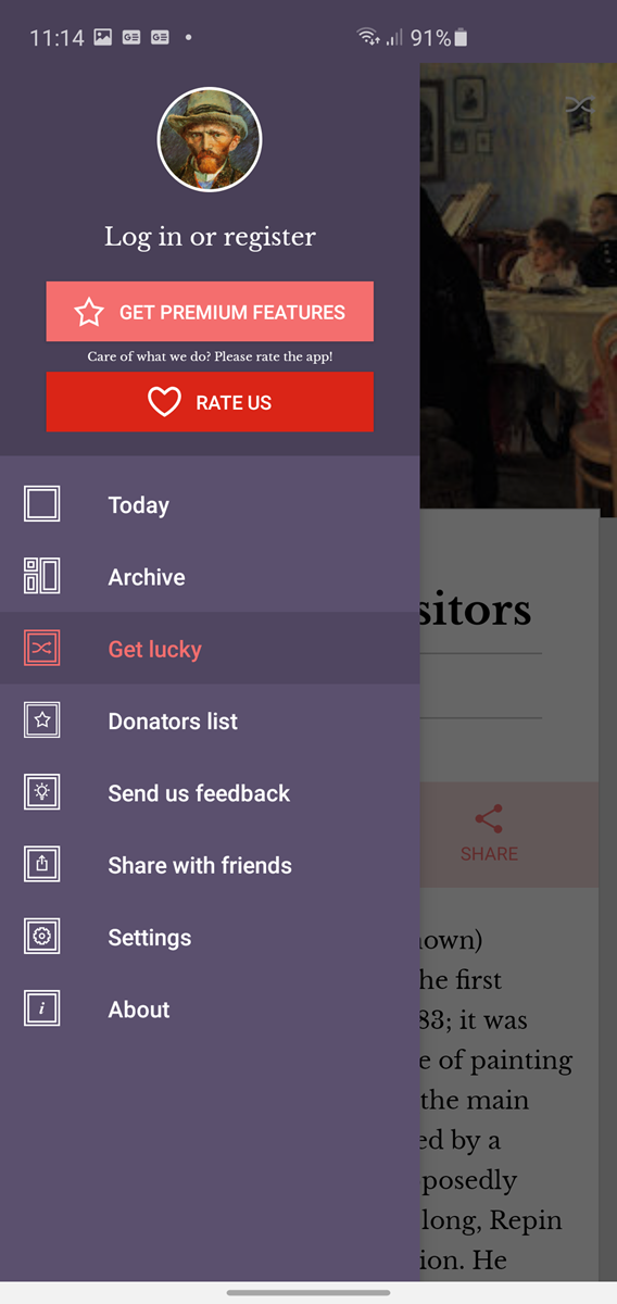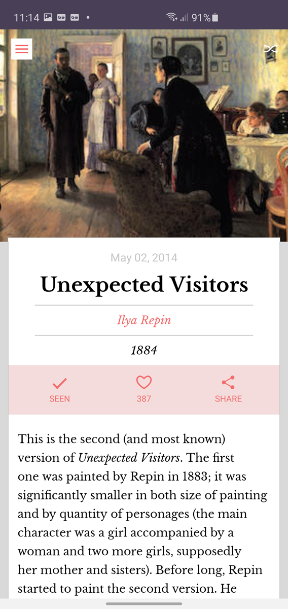 Aplikacija nudi jednostavan pregled arhive dosad objavljenih slika pa je moguće pregledati i koje su sve slike objavljivane prije i tako naučiti više o slikarima i njihovim bezvremenskim djelima. Trenutačno je moguće pregledavati kolekciju s više od 3500 slika te pročitati biografije od 800 umjetnika te informacije o petstotinjak muzejskih kolekcija. Sve bi to trebalo biti i više nego dovoljno i za zagriženije ljubitelje slikarstva.