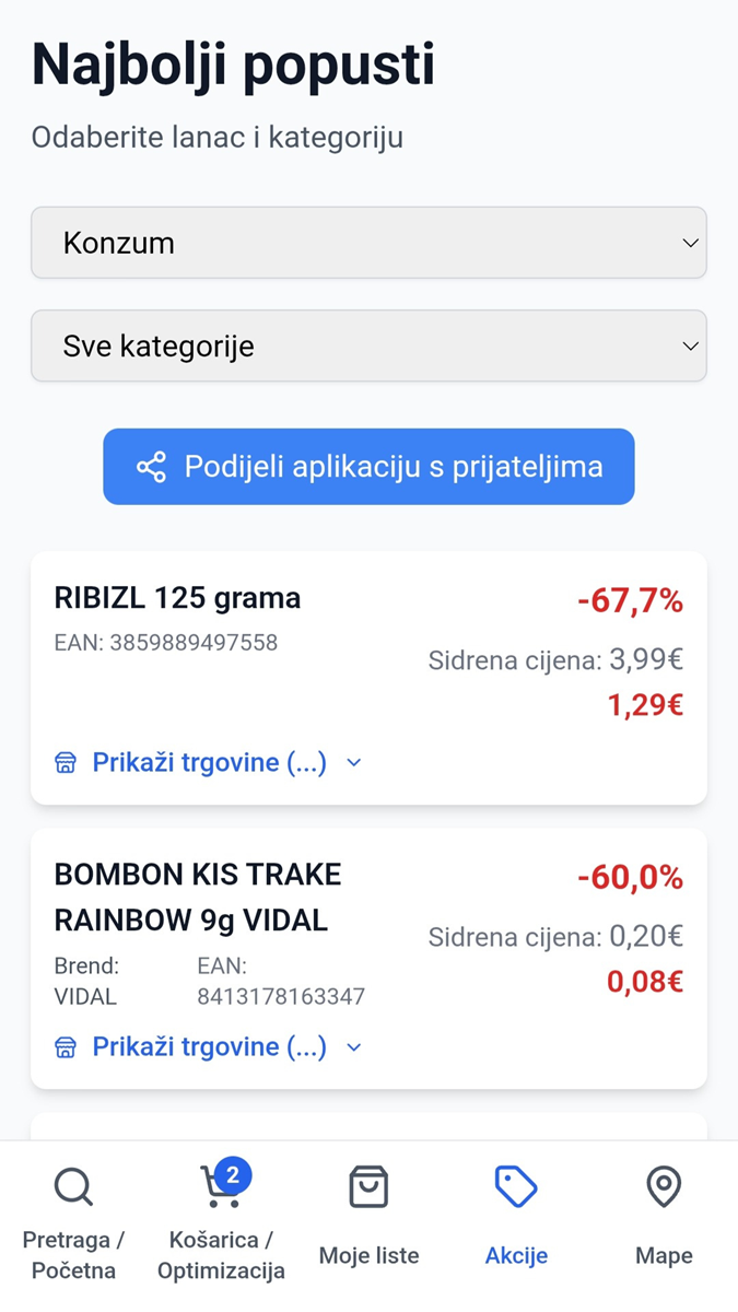 Osim toga, tu je i popis proizvoda koji su trenutačno na akciji u različitim trgovačkim lancima, a jednako je tako koristan i dio posvećen analitici gdje je moguće uspoređivati košarice između različitih trgovina, pratiti promjene cijena, a tu je i karta cijena (lokacije trgovina je također moguće vidjeti na mapi).