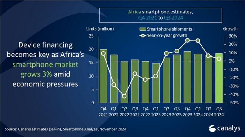 Prema izvješću Canalysa za treći kvartal 2024., afričko tržište pametnih telefona zabilježilo je skroman rast od 3 posto u odnosu na prošlu godinu, dok se za cijelu 2025. predviđa tek 1 posto rasta. Glavni razlog su gospodarske neizvjesnosti u regiji.