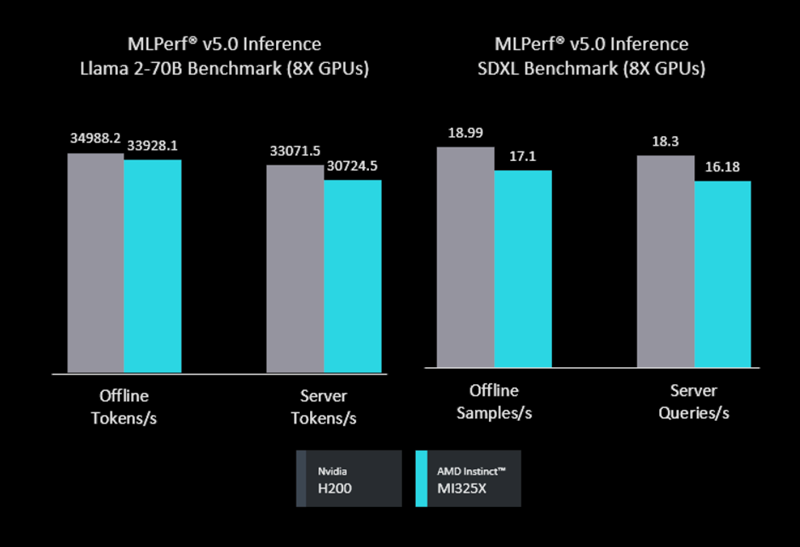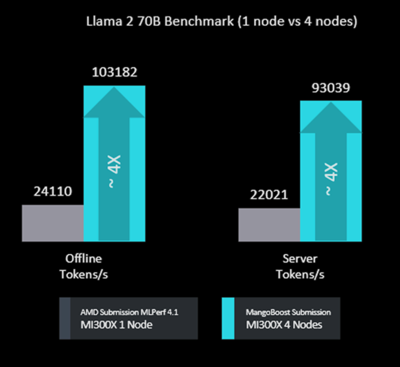 AMD je također objavio predaju MLPerf rezultata s AMD Instinct MI325X GPU-ima, uključujući prvo slanje rezultata s više čvorova u suradnji s MangoBoostom, postižući najveće offline performanse za Llama 2 70B benchmark.