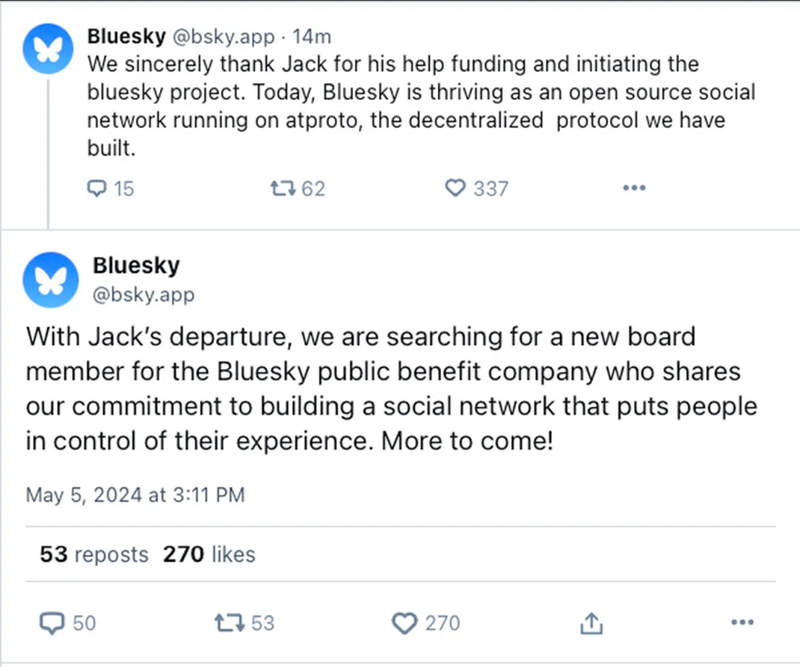 „Iskreno zahvaljujemo Jacku na pomoći u financiranju i pokretanju ovoga projekta. Danas Bluesky raste kao društvena mreža otvorenog koda koja radi na atproto, decentraliziranom protokolu kojeg smo razvili“, objavili su iz Blueskya te napomenuli kako su u potrazi za novim članom upravnog odbora.