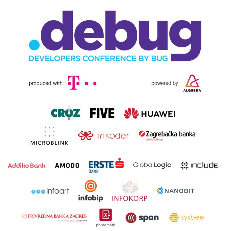 .debug pripremamo uz generalno pokroviteljstvo Hrvatskog Telekoma i organizacijsku suradnju Algebre, a sponzori konfrencije su: CROZ, FIVE, Huawei, Microblink, Trikoder, Zagrebačka banka, Addiko banka, Amodo, Erste banka, GloablLogic, Include, Infoart, Infobip, Infokorp, Nanobit, Privredna banka Zagreb, Photomath, Span i Sysbee.