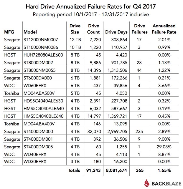 Kako je vidljivo iz priložene tablice kao najnepouzdaniji tijekom četvrtog kvartala 2017. godine pokazao se Seagateov čvrsti disk – ST4000DM000, kapaciteta 4 TB. Naime, tvrtka je u navedenom razdoblju imala ukupno 32.070 takvih diskova, od čega je u vječna lovišta otišlo njih čak 235 što je na godišnjoj razini 2,89% kvarova.