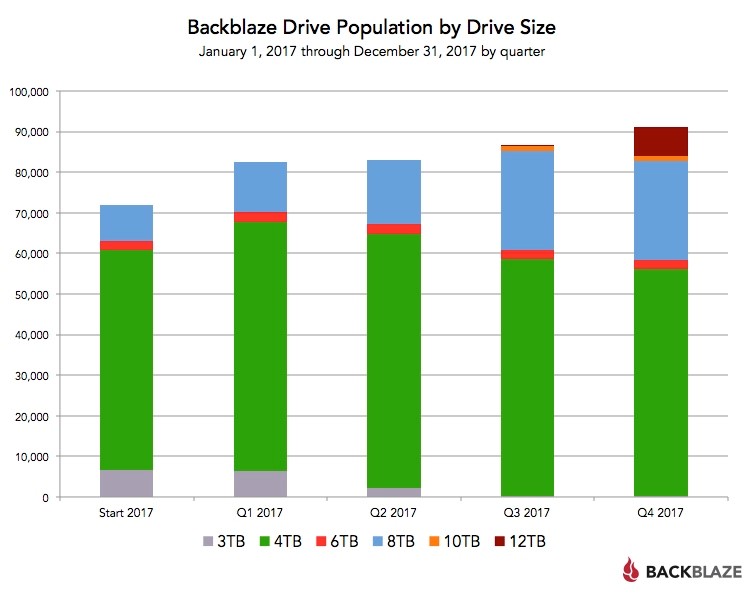 Kako je navedeno na službenom blogu tvrtke, krajem 2017. godine BackBlaze je u pogonu imao 93.240 čvrstih diskova. U izvještaju su naveli rezultate njih 91.305 jer je toliki broj zadovoljio tvrtkine uvjete – nisu bili pogonski diskovi, već isključivo za pohranu podataka te ih je bilo više od 45 komada određenog modela.