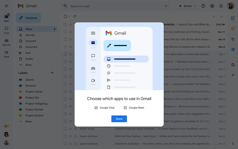 Korisnici koji koriste Gmail, Chat i Meet mogu odrediti koje aplikacije žele uključiti u svoj novi prikaz. Također imaju mogućnost korištenja konfiguracije samo za Gmail.