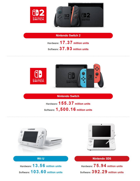 Osim hardvera, impresivne su i brojke prodaje igara. Prvi Switch daleko je ispred konkurencije s čak 1,5 milijardi prodanih naslova. Za usporedbu, Nintendo DS dosegnuo je 948,76 milijuna, dok je treće mjesto pripalo Nintendu Wii s 921,85 milijuna prodanih igara, unatoč manjoj ukupnoj prodaji same konzole.