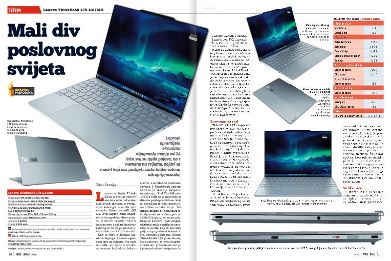 U nizu hardverskih recenzija, istaknuo bih ultrakompaktni prijenosnik Lenovo ThinkBook 13X G4 IMH, sve rjeđe dijagonale od 13,5 inča, ali vrhunskih performansi i dizajna, te velike autonomije. Imamo u ovom broju još tri recenzije laptopa: dva Lenovova (ThinkBook 16p G5 IRX i Yoga Pro 9 16IMH9), i jedan veliki, ali jeftini model HP-a 17-CP2001NM.