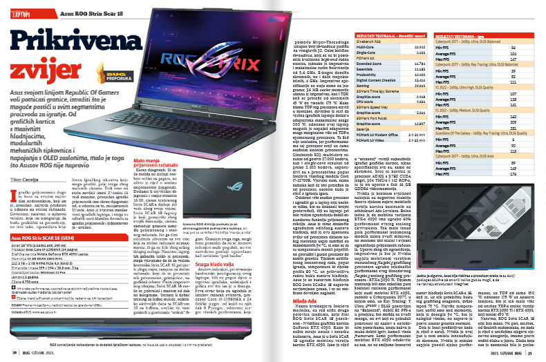Uobičajeno, donosimo vam veliki broj recenzija novog hardvera, gadgeta i nekih neobičnih uređaja. Započinjemo laptopom Asus ROG Strix Scar 18, za koji recenzent kaže da je prema mnogočemu najbolji laptop za igranje na tržištu. Doista se radi o impresivnoj zvijeri, ali sva ta raskoš ima tako opaku cijenu da će, nažalost, mnogi samo maštati kako bi bilo divno imati tako moćno, a ipak prijenosno računalo.