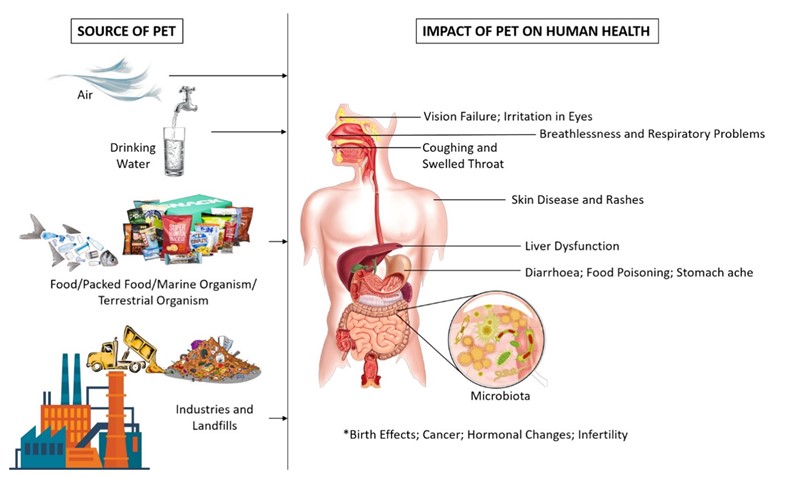 Što se događa s tom platikom, s tim otpadom? Najveća opasnost začudo ne prijeti od kemije nego od fizike – plastika se naime mrvi, usitnjava na sitne čestice koje potom ulaze u vodu i hranu, kako čovjeka tako i životinja. Ovisno o veličini čestica razlikuje se makroplastika, mezoplastika (0,5 – 8 mm), mikroplastika (< 0,5 mm) i nanoplastika (< 100 nm). Najočitija posljedice je da tlo onečišćeno plastikom postaje manje porozno. Mikroplastika u vodi za piće može izazvati probavne smetnje, astmu i alergije, a u najgorem slučaju psihičke poremećaje i kroničnu upalu pluća. Pokusi na puževima pokazali su da izlaganje nitima PET izaziva manje uzimanja hrane za 25 – 35 %, te da oštećuje želučanu stijenku i snižava razinu glutation-peroksidaze (enzima koji štiti od oksidativnog stresa) za 60 %.