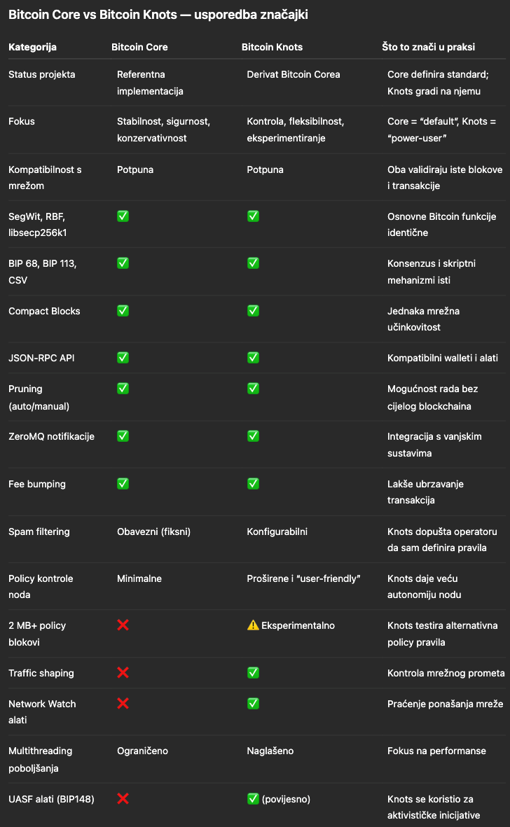 Iako je tehnički kompatibilan s Coreom, Knots operatorima nodeova daje znatno širi raspon alata: od agresivnijeg filtriranja transakcija i preciznijeg upravljanja mempoolom, do većeg utjecaja na to koje se vrste podataka njihov čvor uopće slaže prenositi mrežom.
