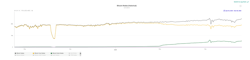 Ako danas promatramo što se događa s bitcoinom i softverom koji pokreće njegove nodeove, vidjet ćemo da broj onih koji koriste alternativne implementacije ubrzano raste. U apsolutnim brojkama njihov je udio još uvijek relativno skroman, oko 20 %, no dinamika promjene je zapanjujuća: broj nodeova koji koriste alternativu Bitcoin Core porastao je s oko 250 u ljeto 2024. na približno 5.400 u veljači 2025. (prema podacima servisa poput coin.dance i bitnodesa).