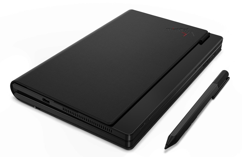 Rubovi oko ekrana prilično su debeli, iako Lenovo u marketinškim materijalima tvrdi suprotno. To s jedne strane izgleda ružnjikavo, ali s druge, olakšava rukovanje tabletom, pogotovo zbog toga što je taj unutarnji rub izveden od blago gumastog materijala – nježnog na dodir, no s odličnim gripom. U sklopu tog okvira nalazi se i web-kamera razlučivosti 5 megapiksela, što je neuobičajeno visoka razlučivost u svijetu PC laptopa. Kamera ima i IR senzor, tako da može služiti za logiranje u Windowse preko sustava Windows Hello. S debljinom od 11,5 mm, Fold je dosta tanak u kontekstu laptopa, no za tablet, relativno je debeo. Solidan dio te debljine otpada na vanjsku zaštitnu ljusku, izrađenu od prirodne kože crne boje. Ideja korištenja tog materijala jednostavna je – zato što se Fold preklapa, u ruci ostavlja dojam tradicionalnog kvalitetnog rokovnika. Prirodna koža tijekom vremena također razvija patinu, što ovom materijalu daje posebni šarm. Kožnata ljuska s jedne strane ima “krilo” koje se koristi kako bi tablet stajao uspravno.