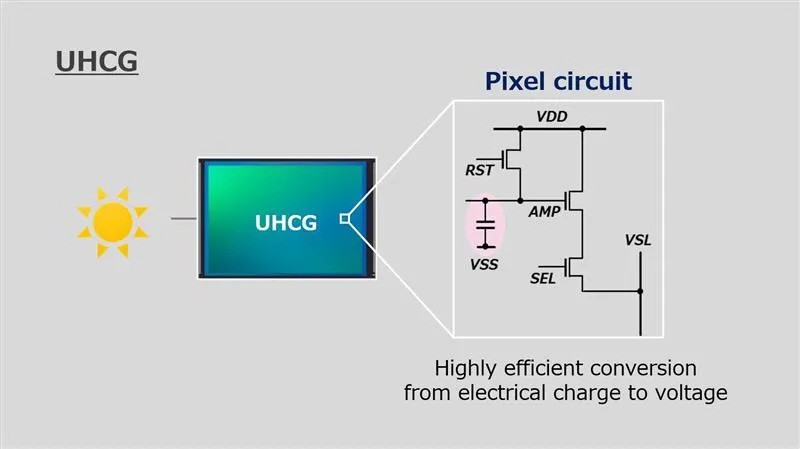 Tu je i UHCG - Ultra-high conversion gain tehnologija za pojačanje signala, koja značajno smanjuje šum u situacijama slabog osvjetljenja. OK, no kako to funkcionira? Za razlučivost od 12,5 megapiksela uz single frame HDR za 30 fps navodi se "UHCG with 3HDR" (Ultra High Conversion Gain with three High Dynamic Range), što bi zapravo značilo da se u tom slučaju koriste tri sklopa (umjesto dva, kao kod DCG-a) za pojačanje signala iz jedne ekspozicije - jedan za tamne, jedan za srednje te jedan za svijetle tonove. Zahvaljujući tome ostvaruje se visok dinamički opseg, a bez ikakvog ghostinga.