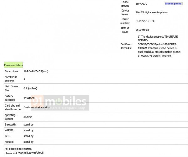 Nakon više mjeseci raznih glasina, Galaxy A70s pojavio se i na stranicama regulatorne agencije TENAA čime je potvrđen dio specifikacija