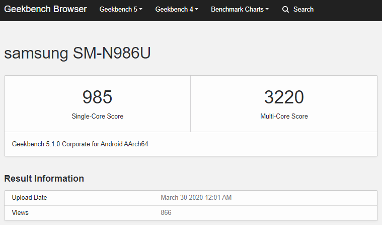 Testiranje uređaja kodnog naziva „samsung SM-N986U“ provedeno je 30. ožujka 2020. godine u ranim jutarnjim satima. Geekbench je testiranom uređaju dodijelio 985 bodova u Single-Core te 3.220 bodova u Multi-Core testovima što je osjetno veći broj bodova u odnosu na prošlogodišnji model Galaxy Note10+ 5G (462 bodova u Single-Core i 2.237 bodova u Multi-Core).
