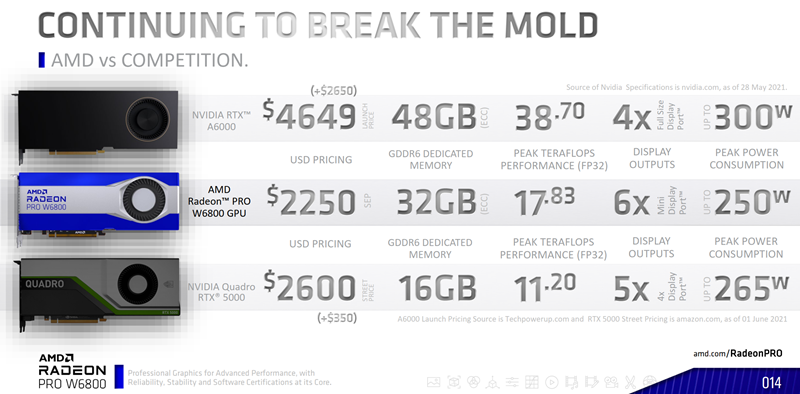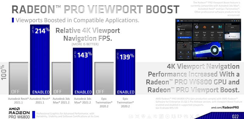 Radeon PRO W6800 najmoćniji je predstavnik serije i temeljen je na reduciranoj varijanti najjačeg RDNA2 GPU-a, pa ima jednak broj CU-ova (60) kao Radeon RX 6800 koji je namijenjen igračima. Za razliku od običnog Radeona, Radeon PRO na raspolaganju ima čak 32 GB GDDR6 ECC memorije. Kartica zauzima dva utora u računalu, a nudi ukupno šest mini DisplayPort konektora. AMD se također hvali niskom razinom buke u odnosu na konkurenciju – 45,9 dBA pri temperaturi GPU-a od 55 °C. Preporučena cijena kartice iznosi 2.250 dolara, čime je kartica pozicionirana ispod Nvidijinog modela Quadro RTX 5000, iako nudi gotovo 50% više performanse te dvostruko viši kapacitet memorije.
