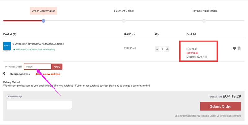 Nakon postupka kratke registracije ili prijave (ako već imate otvoren račun), posjetite košaricu s odabranim proizvodima. Unesite kod za popust „HR35“ i kliknite „Apply“. Nakon potvrde cijena će se umanjiti za 35%.