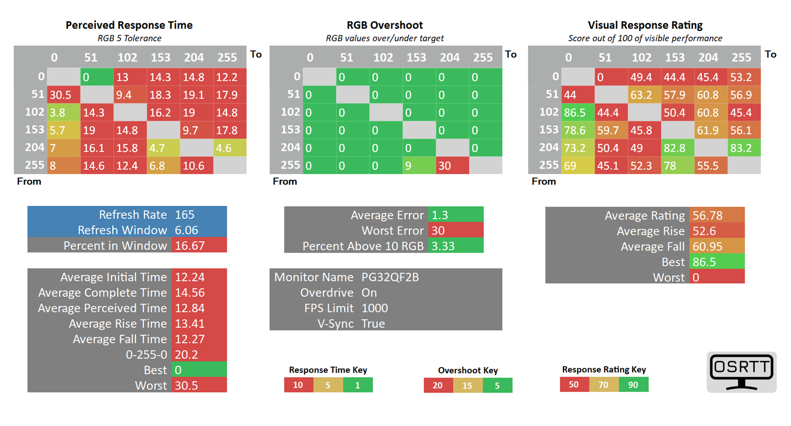 OSRTT Toolom izmjerili smo input lag od 6,7 milisekundi, stoga je responzivnost monitora dostatna čak i za najzahtjevnije igrače, uključujući profesionalce. Kad je riječ o vremenu odziva panela, što je komparativni nedostatak VA panela u odnosu na IPS ili OLED matrice, OSRTT Tool pokazao je prosječno percipirano vrijeme odziva od 13,83 ili 12,84 milisekunde, ovisno o tome jesmo li koristili tehnologiju Overdrive ili ne. Overdrive kod ASRockova monitora može biti samo isključen ili uključen, dakle, ne možemo birati između uobičajene tri ili četiri razine napona za podražavanje piksela, s ciljem ubrzanja njihovih tranzicija. Budući da s uključenim Overdriveom ne dolazi do inverznog ghostinga, a tranzicije piksela ipak su malo brže nego kad je tehnologija isključena, bolje ga je koristiti. Premda u pogledu oštrine pokretnih objekata nedvojbeno zaostaje za gejmerskim IPS panelima, što je osobito vidljivo u sadržajima koji obiluju mračnijim scenama, PG32QF2B ipak biva dostatno brz da bismo ga deklarirali "dovoljno dobrim".