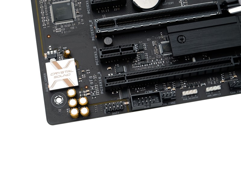 Donjim dijelom ploče dominiraju hladnjak B550 čipseta te uglancani aluminijski hladnjaci M.2 SSD-ova. Oslanjanje na B550 čipset ima svoje prednosti i mane. Prednosti su niža cijena i činjenica da B550 ne treba aktivno hlađenje kao skuplji čipset. S druge strane, B550 nema PCIe 4.0 kontroler, pa su zbog toga samo primarna dva PCIe utora i primarni M.2 konektor posljednje, četvrte generacije. Osim dva spomenuta velika PCIe x16 utora, a koji mogu raditi u kombinaciji x16/x0 ili x8/x8, na raspolaganju su još dva PCIe 3.0 x1 utora i jedan PCIe 3.0 fizički x16, no interno x4. Treba naglasiti da svi ovi utori spojeni na kontroler u čipset dijele kanale s drugim uređajima. Veliki utor dijeli kanale s Thunderbolt 4 kontrolerom, dok dva manja dijele propusnost s drugim M.2 utorom. Samim time, nema ih baš smisla koristiti i na ploči su reda radi.