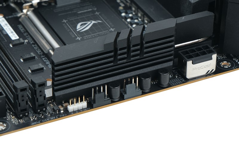 Na njoj se također nalaze i prednji konektori za spajanje kabela s kućišta, četiri SATA porta i dodatni konektor za spajanje RGB traka. Samim time, ako ne namjeravate koristiti SATA konektore, karticu nema potrebne ugrađivati. Što se tiče ugrađenog RGB osvjetljenja, ovaj model dosta je skroman – osvjetljen je jedino element s ROG logom na spoju između VRM i M.2 hladnjaka. Od internih konektora tu su još samo dva konektora za ventilatore (dakle, ukupno tri), skrivena iza hladnjaka na gornjem rubu ploče.