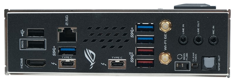 | Stražnji konektori | BIOS FlashBack tipka Tipka za resetiranje BIOS-a 2 × Wi-Fi antene 1 × LAN (RJ45) 1 × HDMI 2.1 2 × USB 2.0 3 × USB 3.2 Gen1 2 × USB 3.2 Gen2 2 x Thunderbolt 4 3 × audio konektor 1 × S/PDIF |