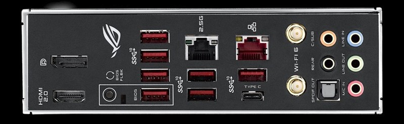 S obzirom na to da je riječ o ploči visoke klase koja nema videokonektore, moglo se očekivati da na stražnjoj IO pločici također imamo hrpu USB konektora. Tako je i bilo. Na raspolaganju su nam četiri USB-a 3.1 Gen1 (plavi konektori), sedam USB 3.1 Gen2 konektora (crveni konektori) te USB-C 3.1 Gen2. Na IO pločici, koja inače ima integriran zaštitni limić, također imamo dva konektora za WiFi adapter, dva konektora za klasičnu mrežu, pet analognih konektora zvučne kartice, jedan digitalni optički izlaz zvučne kartice, tipku za resetiranje postavki BIOS-a te tipku za automatsku nadogradnju BIOS-a pomoću USB memorije.