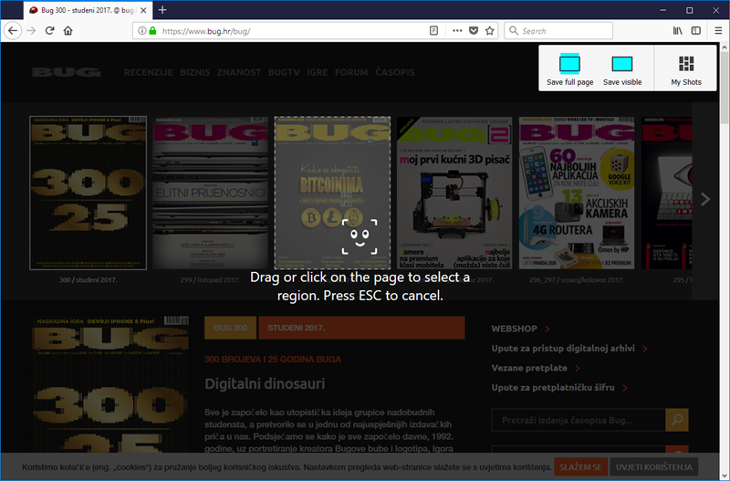 Iznenađenje je i koristan dodatak Firefox Screenshots koji omogućuje jednostavno snimanje sadržaja kartice otvorene u Firefoxu i to u cijelosti ili samo jednog njezinog djelića poput neke fotografije ili okvira. Posebno je zgodno to što alat zna automatski prepoznati individualne elemente na stranici koje bi se možda htjelo snimiti kao sliku, a sve će snimke uredno biti dostupne na Firefoxovom za to namijenjenom servisu od kuda ih je lako moguće podijeliti s drugima koristeći izravne poveznice ili poznate društvene mreže.