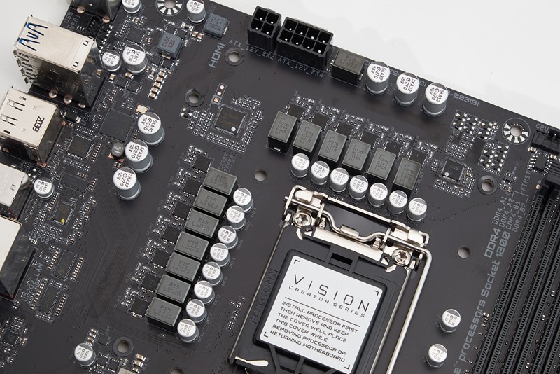 Ispod bijelog ukrasnog oklopa na gornjem dijelu ploče nalazi se hladnjak naponskog modula. Sastoji se od jednog konvencionalnog grubog komada aluminija, te od rebrastog, u rashladnom smislu naprednijeg dijela crne boje. Dva su komada spojena s toplovodom cijevi, a hlade 13-faznu naponsku jedinicu, kod koje je 12 faza odvojeno za napajanje procesora, a jedna za napajanje integrirane grafike. Napajanjem upravlja jedan kontroler kao na modelu Master, ISL69269, koji u ovom slučaju radi u konfiguraciji 6+1. Na primarnih šest kanala spojeni su u paraleli 60-amperski SiC649A DrMOS-ovi (dakle, 12 faza ukupno), a sedma faza jednake je građe, samo bez udvostručavanja komponenti. U praksi se to rješenje solidno nosi s i9 procesorom (Core i9-10850K) koji je forsiran s MCE-om – bez dodatnog aktivnog hlađenja izmjerili smo 72 °C sa sondom, dok je kontroler prijavljivao 76 °C. S ručnim overklokiranjem procesora na 5 GHz, temperature rastu na 84 i 88 °C, što znači da je u takvim uvjetima preporučljivo složiti ventilator da puše na hladnjak. Od overklokerskih dodataka Vison G ne nudi ništa, no tu je barem jednostavna LED dijagnostika u donjem desnom kutu ploče.