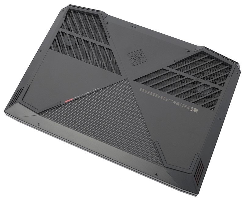 Omen krasi vrlo agresivan oštri dizajn, koji privlači pozornost pogledano ovisno o tome gdje laptop budete odlučili koristiti. Čvrsti poklopac izrađen je od debele plastike ukrašene crvenim detaljima, atraktivnim logom Omen i uzorkom koji imitira karbonska vlakna. Svijanja pod opterećenjem kakva često vidimo na jeftinijim uređajima zato nema. Ekran je za bazu pričvršćen s dvije usko postavljene šarke, koje imaju dobro pogođen otpor, pa je laptop lako otklopiti jednom rukom.