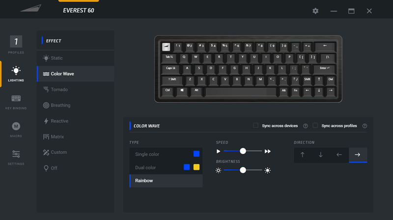 Za upravljanje tipkovnicom koristi se Mountainova aplikacija Base Camp, koja nudi sve uobičajene opcije za konfiguraciju tipkovnice. Tako možemo, među ostalim, upravljati bojom svake pojedine tipke i svjetlosnim efektima (Static, Color Wave, Tornado, Breathing, Reactive, Matrix), mijenjati funkcije svih tipki, snimati makroe, te pohranjivati sve postavke u pet korisničkih profila.