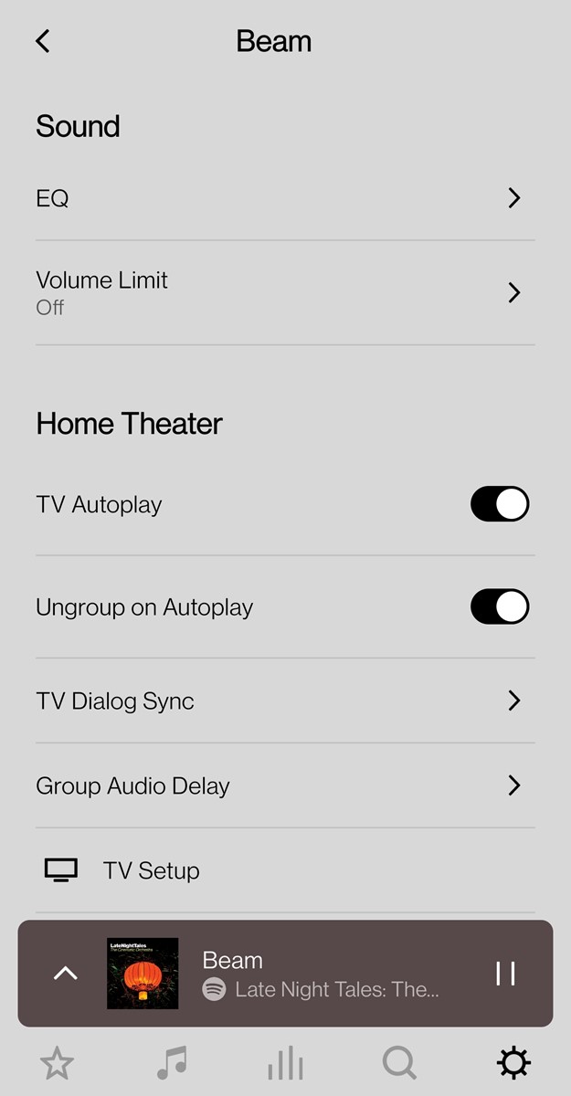 Zanimljivo je i kako se Beam ponaša kao klasični soundbar. Recimo da vam je televizor isključen, a na Beam ste, pomoću aplikacije Sonos S2, pustili omiljenu radijsku postaju ili playlistu s nekog glazbenog servisa. Nakon uključenja televizora, Beam se automatski prebacuje na HDMI eARC ulaz i započinje reproducirati zvuk s TV-a. Ako ne želite da se tako ponaša, jednostavno ćete u njegovim postavkama isključiti opciju "TV Autoplay". Tu je i opcija "Ungroup on Autoplay", koja će Beam automatski ukloniti iz grupe sa zvučnicima u drugim prostorijama, kako bi na njima nastavilo svirati ono što je dotad sviralo. Na istom mjestu također možemo vremenski sinkronizirati zvuk i sliku (u slučaju bilo kakvog kašnjenja), kao i grupe Sonosovih zvučnika. Najzad, aplikacija nudi opcije Night Sound i Speech Enhancement. Prva je, kako joj naziv kaže, namijenjena noćnom korištenju, a služi glasnijoj reprodukciji vrlo tihih zvukova, uz istodobno utišavanje glasnih. Speech Enhancement dodatno ističe vokale, što u procesu testiranja Beama nismo nalazili potrebnim.