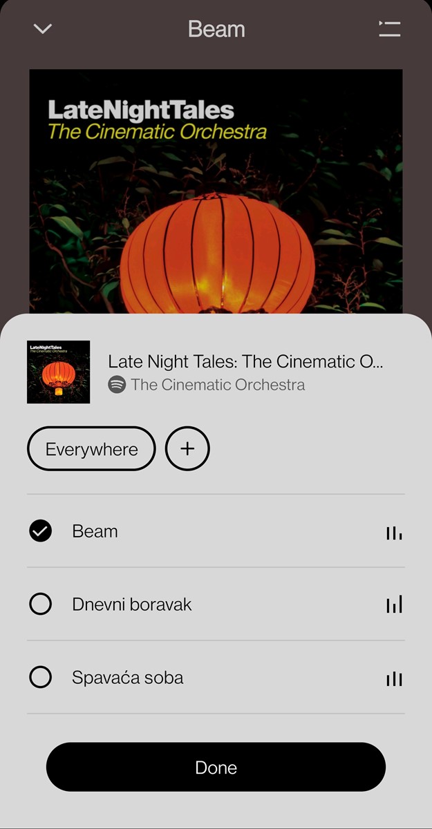 Od ostalih načina slanja zvuka na Beam, podržani su još samo Apple AirPlay 2 te Spotify Connect. Potonji nam dozvoljava da unutar Spotifyeve stolne ili mobilne aplikacije odaberemo Beam s liste dostupnih uređaja za reprodukciju zvuka, nakon čega će on smjesta započeti s reprodukcijom glazbe.