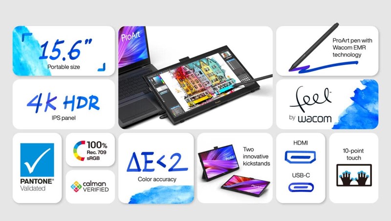 PA169CDV je PANTONE validiran i verificiran Calmanovim instrumentom, što ga čini prvim prenosivim monitorom koji ima dvostruki certifikat. Tvornički je unaprijed kalibriran na Delta E < 2 točnost boja te ima 10-bitni prikaz boja, 100% sRGB i 100% Rec.709 gamute boja..ProArt Pen koristi Wacom EMR tehnologiju koja pruža prirodan osećaj rukopisa. Lagana olovka nema baterije i kompatibilna je sa ASUS Dial-om, pružajući korisnicima prečice kada rade s podržanim Adobe softverom.