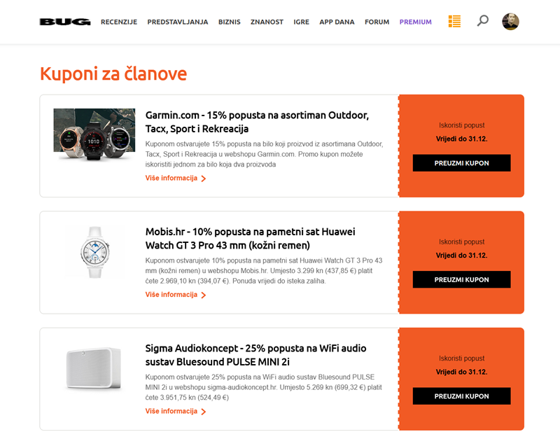 Nakon registracije zavirite u vaš korisnički profil. Tamo ćete pronaći sekciju „Kuponi za članove“. Prikazat će vas se slučajnim odabirom tri kupona. Međutim, to nije sve! Klikom na gumb „vidi sve kupone“ otvorit će vas se zasebna stranica s mnoštvom različitih ekskluzivnih kupona i popusta u domaćim IT trgovinama. Međutim, ako imate Start digitalni plan, tada ne možete iskoristiti navedene kupone jer oni su dostupni od Bug Plus paketa.
