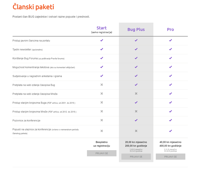 Ako ste i dalje korisnik isključivo besplatnog Start paketa, potičemo vas da nadogradite paket na Bug Plus (20 kn mjesečno ili 200 kn godišnje) ili Pro (40 kn mjesečno ili 400 kn godišnje). Odlučite li odabrati čak i samo jednokratni mjesečni Bug Plus paket za 20 kn, ta investicija bi vam se mogla višestruko isplatiti ako želite iskoristiti barem jedan od popusta koje vam nudimo u suradnji s domaćim trgovcima.