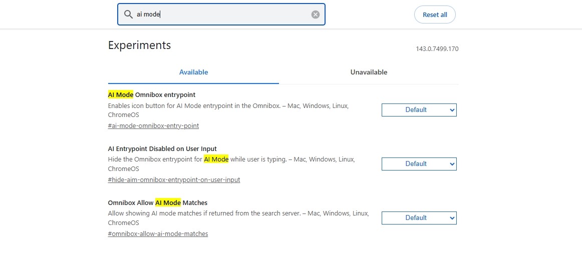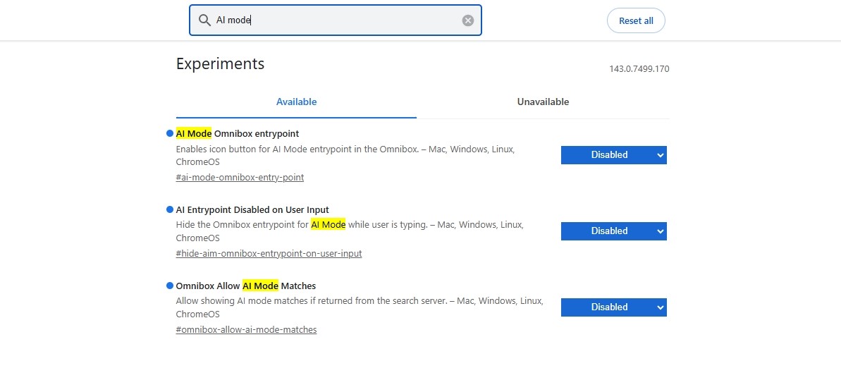 Prvo što treba učiniti jest u adresnu traku (omnibox) Chromea upisati chrome://flags, čime se otvara popis opcionalnih i eksperimentalnih funkcija preglednika. U vrhu tog će se popisa naći tražilica, u koju je potrebno upisati "AI Mode", pri čemu će Chrome izbaciti tri rezultata (AI Mode Omnibox entrypoint, AI Entrypoint Disabled on User Input, Omnibox Allow AI Mode Matches). Vjerojatno će svako od polja uz njih biti postavljeno na "Default", a na vama je samo da ih prebacite na "Disabled" i ponovno pokrene Chrome.