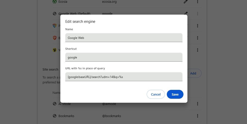 - URL: {google:baseURL}/search?udm=14&q=%s