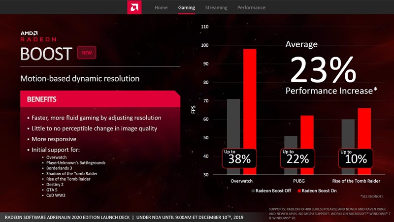 Radeon Boost je za sada dostupan isključivo u nekoliko DirectX 11 naslova – Overwatchu, PUBG-u, Borderlandsu 3, Shadow of the Tomb Raideru, Rise of the Tomb Raideru, Destinyu 2, GTA-u V i CoD-u WW2. Radi na Windowsima 7 i 10, te svim karticama na GCN i RDNA arhitekturi (RX 400 serija i novije). AMD podršku u igrama namjerava proširivati s budućim verzijama drivera. Prosječan rast performansi prema AMD-ovim mjerenjima je 23%. Mi smo Boost isprobali u igri Bordelands 3, u kombinaciji s Radeonom RX 5700 XT pri razlučivost 4K (koja za ovu karticu inače nije optimalna). Boost funkcija ovdje na tvorničkim postavkama osigurava maksimalna rast performansi od oko 35% što će reći da framerate skače s 30-ak na 40-ak fps.