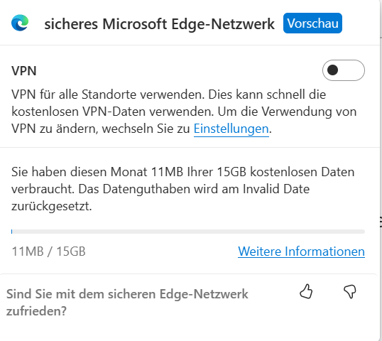 Isto tako, Microsoftovo rješenje bit će ograničeno u pogledu prometa. Za njezino korištenje potrebno se u Edge prijaviti Microsoftovim korisničkim računom. Sudeći po jednom screenshotu njemačkog korisnika, koji se dijeli na društvenim mrežama, Edge Secure Network dat će 15 GB besplatnog VPN prometa. Ranije najave, podsjetimo, spominjale su tek 1 GB.