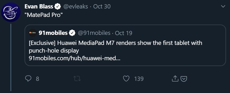 Tablet je prepoznatljivog dizajna, ima digitalnu olovku koja se pomoću magneta spaja na desnu bočnu stranu tableta kada je potrebno napuniti njezinu bateriju. Zajednička točka su im i podrška za tipkovnicu te USB-C port. Blass je u međuvremenu otkrio i kako će službeni naziv tableta na kraju glasiti MatePad Pro.