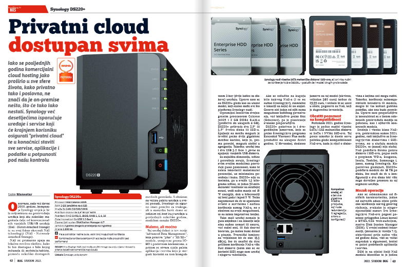 Među brojnim hardverskim tekstovima spomenuo bih detaljan prikaz NAS-a Synology DS220+, namijenjenog SOHO i poslovnim korisnicima, a svima kojima je takva vrsta zaštite podataka potrebna, bit će posebno korisna i srodna softverska tema Synology Active Backup, u kojoj su opisane mogućnosti tog besplatnog seta alata za upravljanje mrežnim backupom.