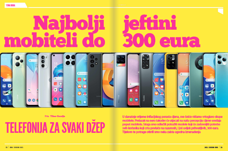 U svijetu mobitela najviše pozornosti dobivaju ekstremna rješenja. Proizvođači su, tragajući za nekom osebujnošću i izvedbom koja će ih razlikovati od konkurencije, zabrazdili s pretjerivanjem. Bilo da se radi o kamerama sa stotinama megapiksela, preklapanjima prema van, unutra, dolje ili gore, ugradnji hardvera koji donosi performanse usporedive s igraćim konzolama, rezultat svega toga je da mobiteli postaju sve skuplji i skuplji. U praksi, pak, 90%, ako ne i više, potreba prosječnog korisnika mogu zadovoljiti i daleko jeftiniji modeli, pa smo se za ovomjesečnu temu broja odlučili upustiti u potragu baš za takvima, jeftinim, a dobrim mobitelima. Procijenili smo da je razumno granicu postaviti na nekih 300 eura, što je u praksi značilo da je većina testiranih mobitela imala cijenu ispod 240 eura (odnosno 1.800 kuna, ako vam je tako lakše snaći se). Ukupno ih je recenzirano 12, pa ako mislite iskoristiti Crni petak za kupnju, upravo su to modeli koji tada budu još jeftiniji.