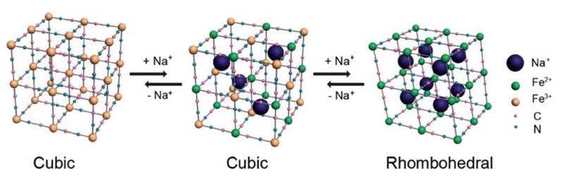 Riječ je o tome da je kristalna rešetka dovoljno prostrana da u nju može ući i ion natrija (Na+), promjera 0,204 nm, što je znatno više od promjera litijeva iona (Li+), 0,152 nm. Kada ion Na+ uđe u kristalnu rešetku, u nju mora, da bi ostala električki neutralna, ući i elektron, no on se ne veže za Na+ nego za Fe3+ koji pritom prelazi u Fe2+. Jednostavno govoreći, stvara se klopka za natrijeve ione, čime se kristali berlinskog modrila pretvaraju u katodu natrij-ionske baterije.
