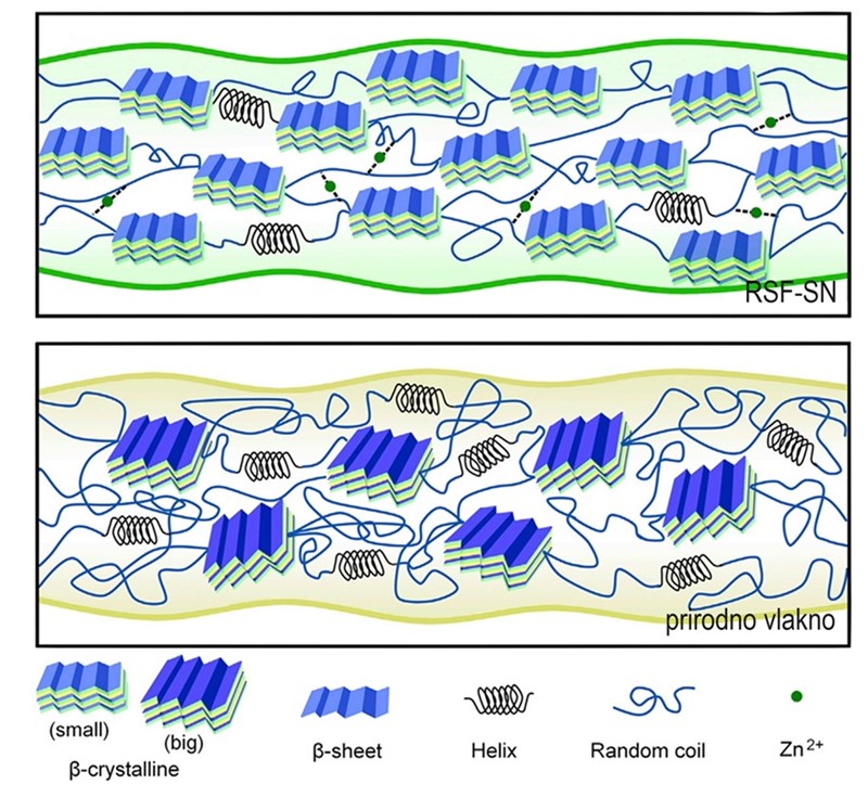 No to nije sve, jer regenerirana svila ima i bolju strukturu. Da bismo razumjeli što to znači, treba znati da polipepidni lanac nije ispružen, nego na neki način namotan. Kemičari razlikuju tri osnovna načina „namatanja“ proteinskog lanca. Prvi je namot posve nasumičan (random coil). Druga su pak dva namota pravilna. Prvi namot je zavojnica ili, točnije, alfa-zavojnica (α-helix). No za razliku od molekula DNA koje grade dvostruku zavojnicu, α-zavojnica proteina je jednostruka te – kao i zavojnica DNA – sasvim pravilna: u svakom zavoju nalazi se točno 3,6 aminokiselinskih ostataka. No ta struktura ne pridonosi čvrstoći proteina, pa tako ni fibroina. Njegovoj čvrstoći pridonose plosnate strukture, beta-ploče (β-sheets) jer su kompaktnije, a osim toga se slažu jedna na drugu i tako učvršćuju lanac. Da je upravo to uzrok povećanja čvrstoće svile nakon regeneracije pokazala su mjerenja: udio beta-ploča porastao je od 44,2 na 55,8 %, a nasumičnog klupka opao sa 22,1 na 14,8 %.
