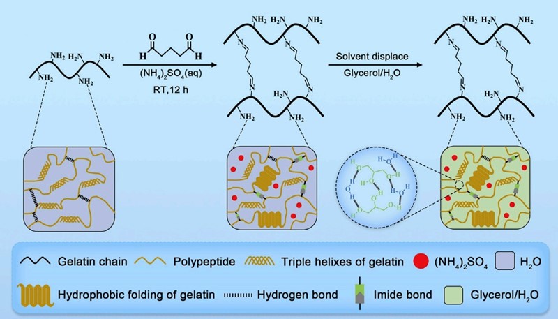 Sve počinje od obične želatine koja se otopi u vodi kojoj je dodat amonijav sulfat radi stabilizacije – uz još jedan važan sastojak: aldehid glutarne kiseline (glutaraldehid ili pentadial). Zašto baš ta kemikalija? Glutaraldehid služi za poprečno povezivanje polipeptidnih lanaca molekula želatine pri čime nastaje gel, no mnogo čvršći od gela čiste želatine, dobro nam poznate hladetine. Nakon toga slijedi najvažniji dio postupka, a to je djelomična zamjena vode glicerolom (glicerinom).