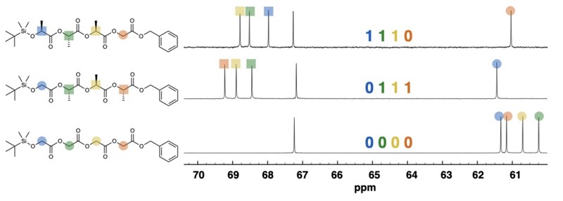 Čitanje koda zapisanog u tetrameru ide međutim mnogo brže, spektroskopskim metodama. Za to služi metoda nuklearne magnetske rezonancije (NMR), ista ona koja se koristi u medicini (MR), no ovdje se ne čita signal jezgara vodika, 1H, nego jezgara ugljika, 13C. Svaka jezgra ugljikova izotopa 13C osjeća naime magnetsko polje susjednih jezgara, pa se iz rasporeda signala u spektru 13C-NMR može zaključiti koja je monomerna jedinica za koju povezana. Za čitanje dužih sekvencija služi pak masena spektroskopija. U toj se metodi molekula ionizira da bi se potom raspala na fragmente, a fragmenti odvojili u magnetskom polju. Metoda je bolja i osjetljivija, ali i onome tko prvi put za nju čuje jasno je da se takvom analizom uzorak uništava.